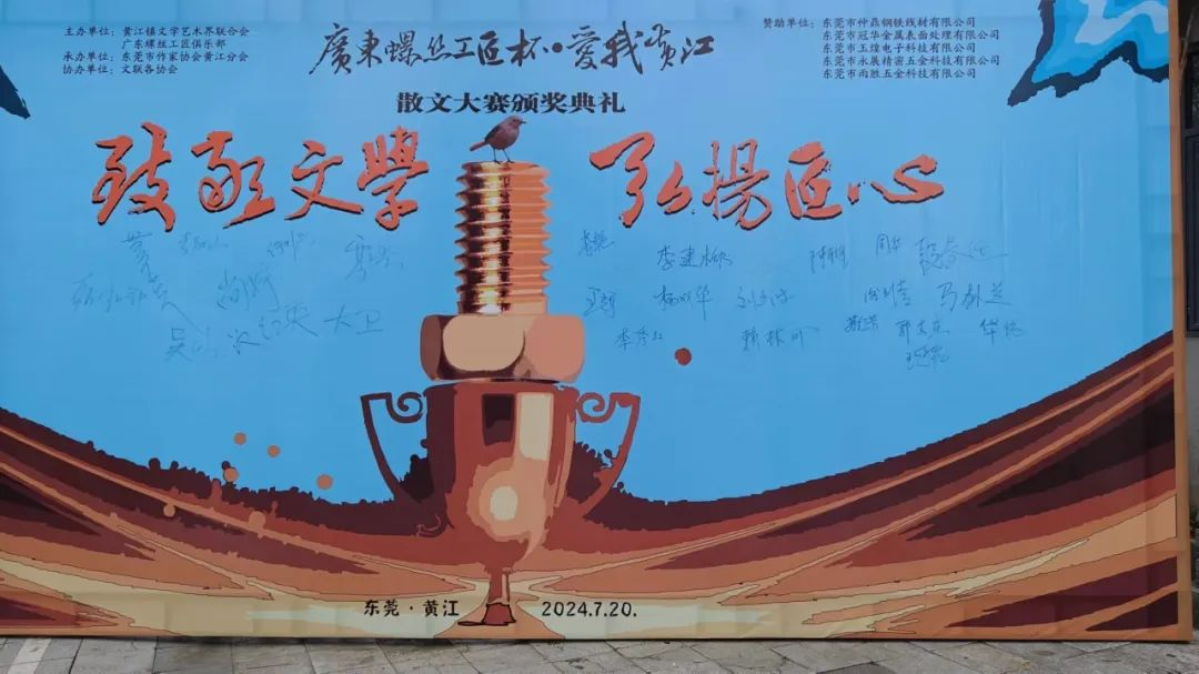 7月20日 ,由黄江镇文学艺术界联合会与广东螺丝工匠俱乐部联合举办,东莞市作家协会黄江分会承办,文联各协会协办,并得到东莞市仲鼎钢铁线材有限公司、东莞市玉煌电子科技有限公司、东莞市冠华金属表面处理有限公司、东莞市永展精密五金科技有限公司及东莞市雨胜五金科技有限公司等企业慷慨赞助的“广东螺丝工匠杯●爱我黄江”散文大赛圆满落下帷幕。共计120余人参加。