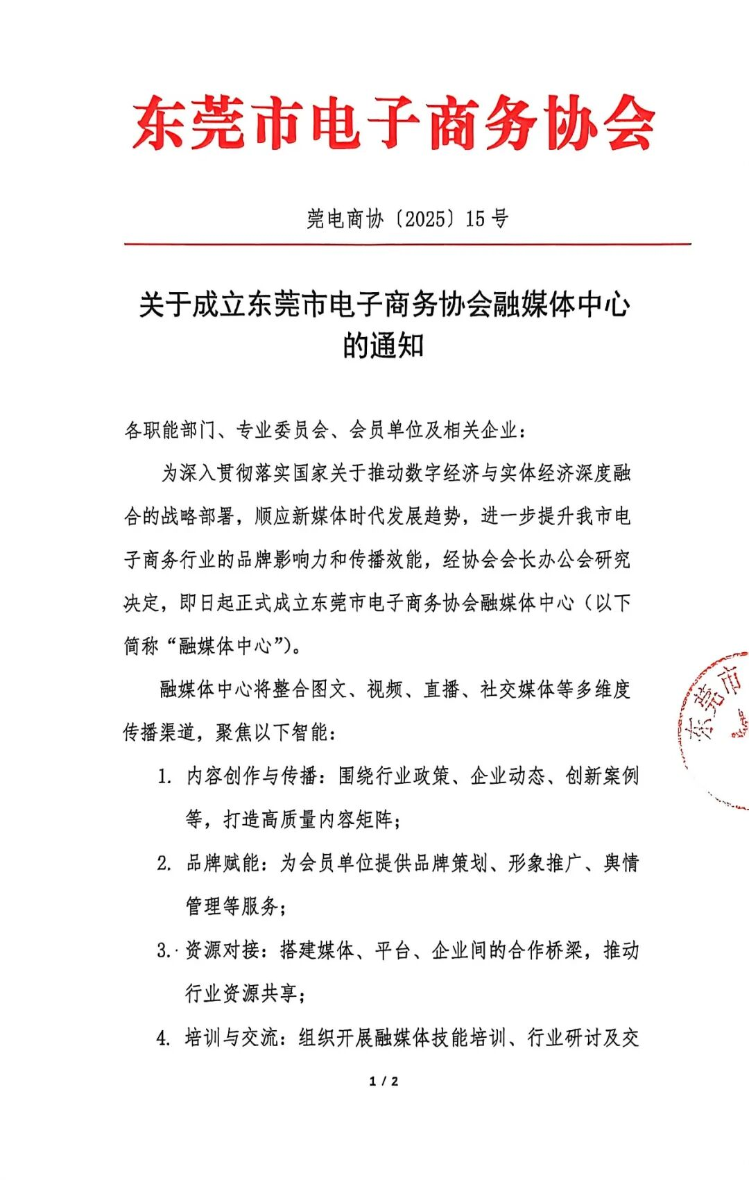 东莞,2025年11月9日——为积极响应国家关于推动数字经济与实体经济深度融合的战略号召,顺应新媒体时代发展潮流,东莞市电子商务协会今日正式发布《关于成立东莞市电子商务协会融媒体中心的通知》(莞电商协〔2025〕15号),标志着东莞市电子商务协会融媒体中心(以下简称“融媒体中心”)正式成立并投入运营。